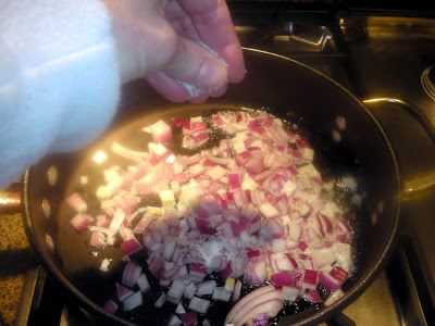 Chop up 1 onion, or 3 shallots. Put them in the skillet with the butter, over medium heat.